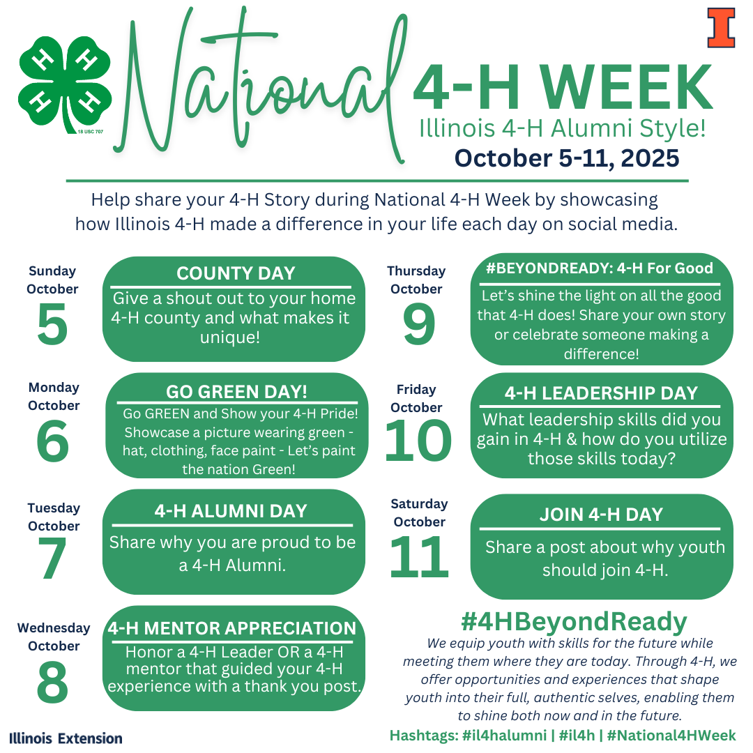 Are you ready to make a difference and help us spread the word about 4-H? Whether you're a proud 4-H alum or a supporter, you can participate with easy, daily social media posts to highlight the 4-H community. We’ll provide everything you need—prompts, graphics, and inspiration.